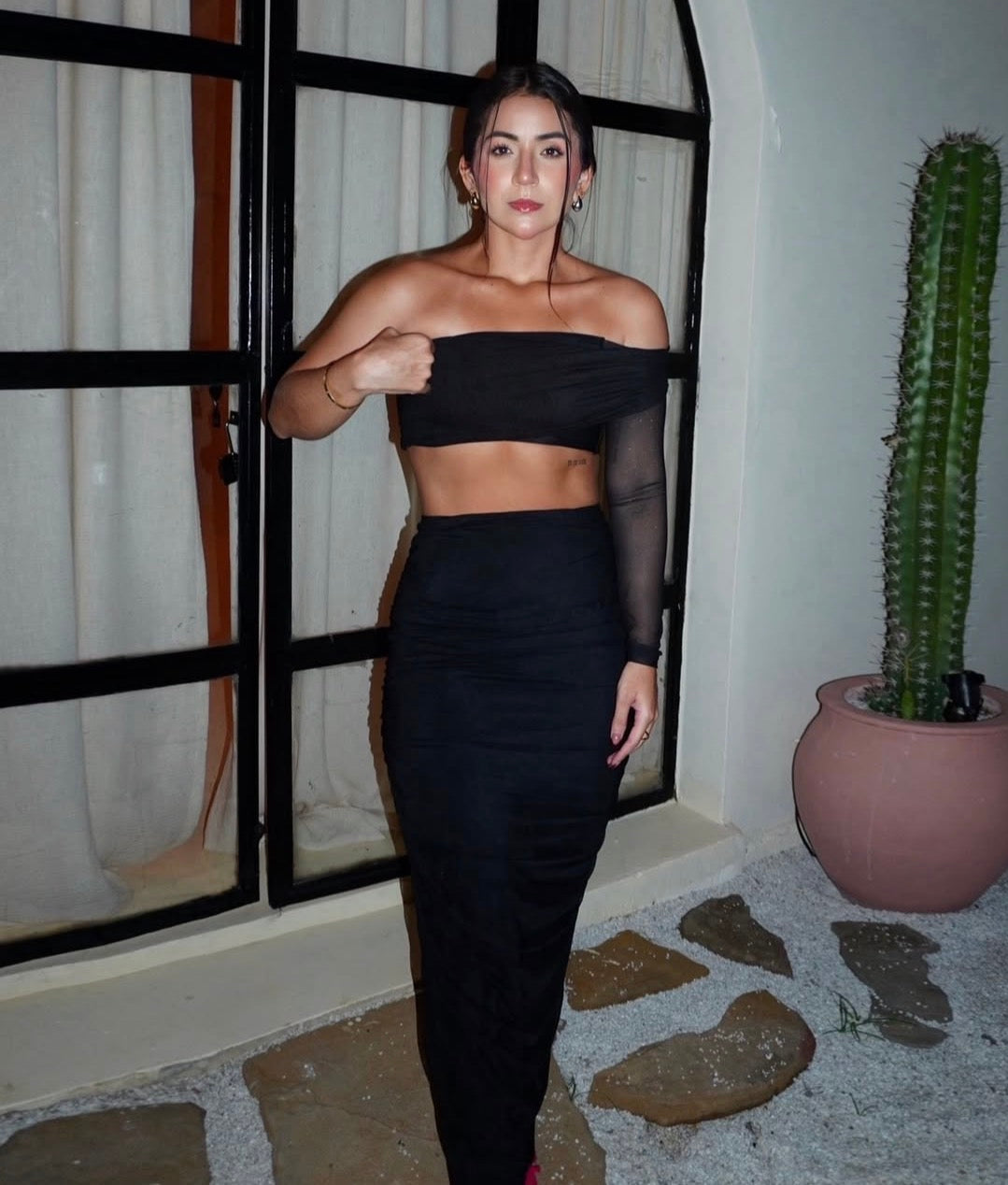 El Set Arya combina una falda de tiro alto con un top asimétrico de manga transparente, creando una silueta alargada y estilizada. Úsalos juntos para un look de impacto o por separado para multiplicar tus outfits.